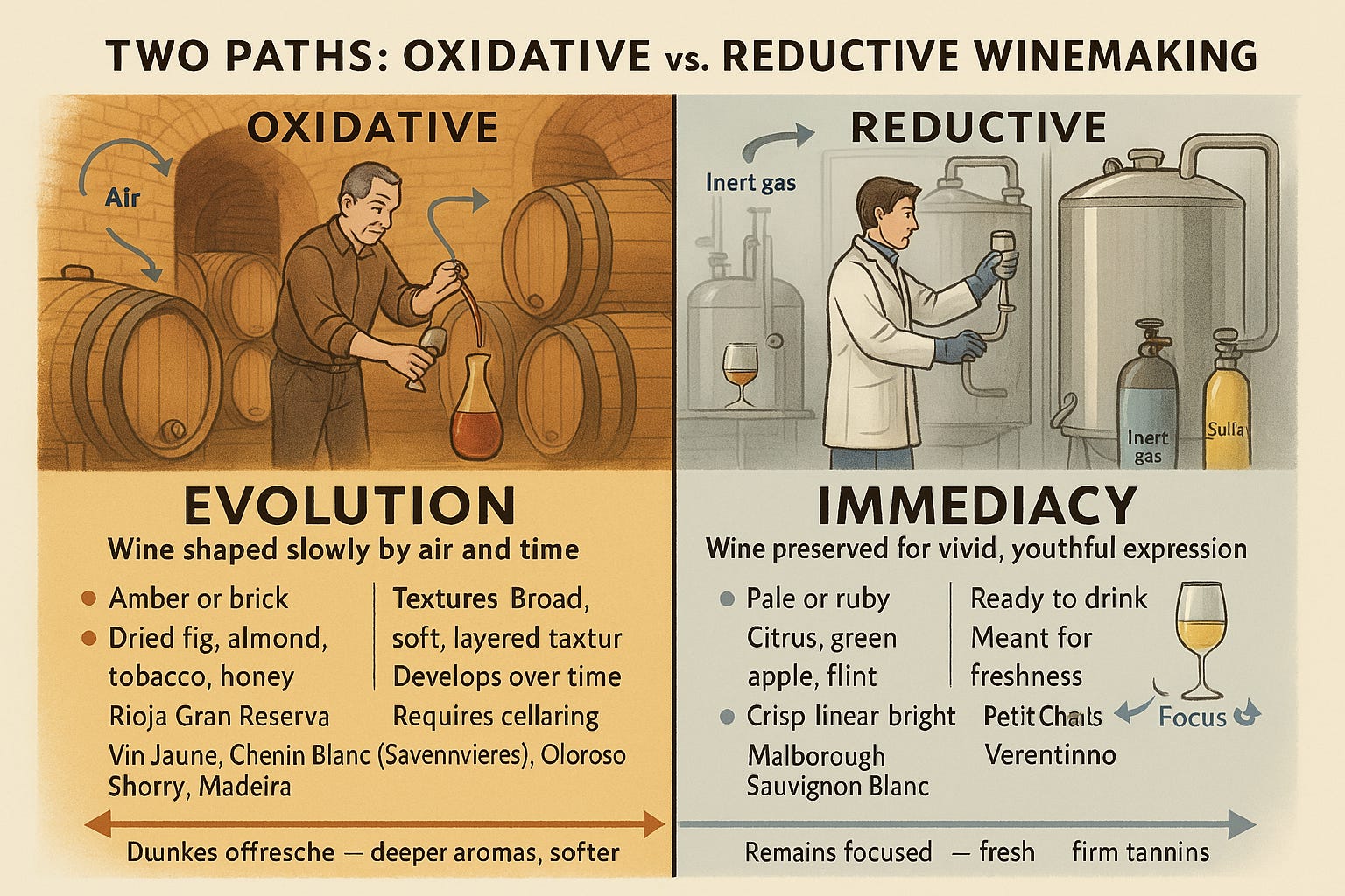 In winemaking, the distinction between oxidative and reductive approaches isn’t just about technique—it’s a matter of philosophy. It’s how a winemaker thinks about time. About how a wine should grow. About whether it should open gradually or speak right away. The terms themselves—oxidative and reductive—can sound clinical. But what they really point to are two different relationships with air, and through that, two different ways of imagining what a wine is meant to become.